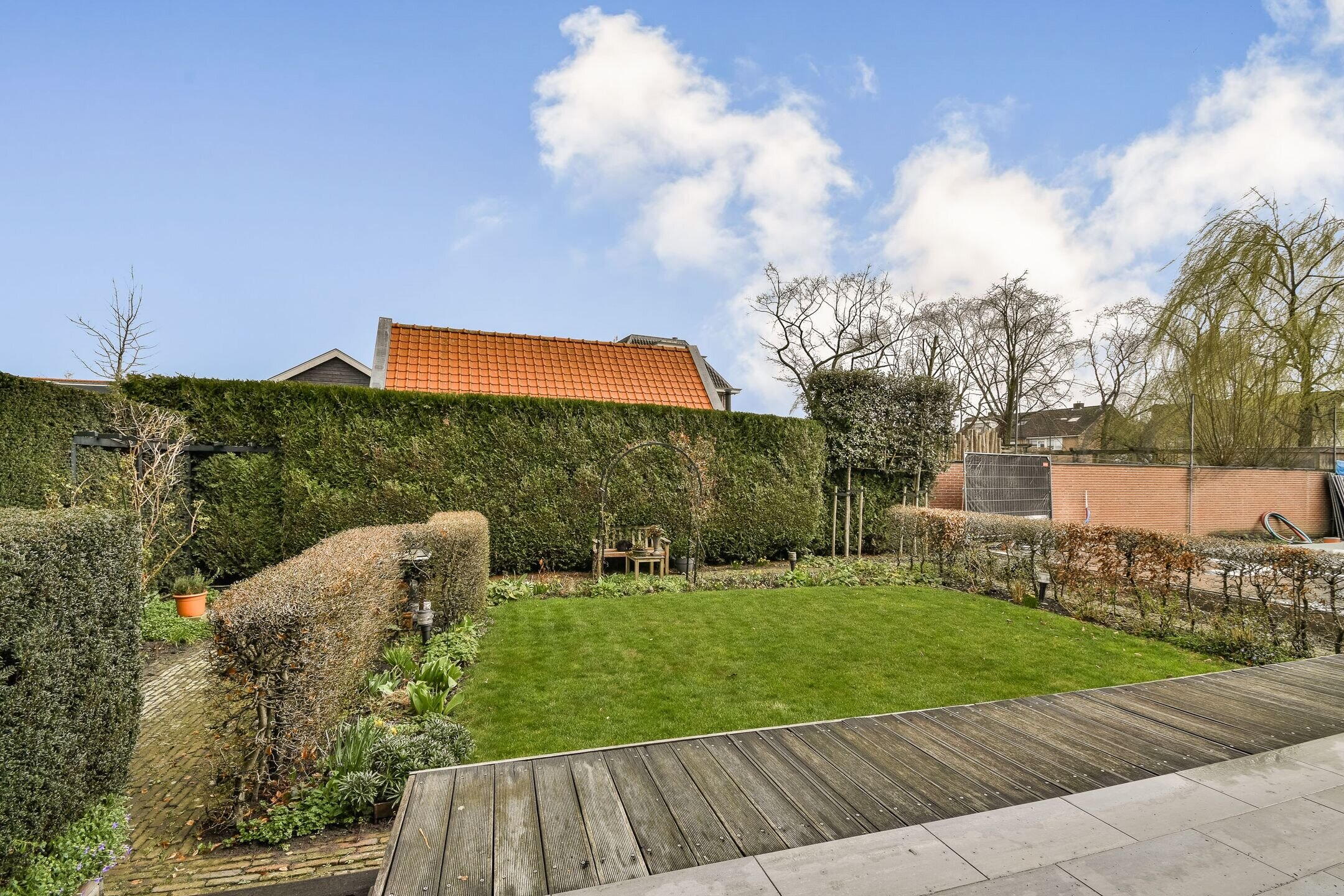 De nette aangelegde achtertuin is prima onderhouden en beschikt onder andere over een betegeld zonneterras met aansluitend een vlonderterras. Daarnaast is er volop groen aanwezig in de vorm van een gazon en plantenborders met vaste beplanting en boompjes. De hoge hagen aan de noord- en oostzijde zorgt voor veel privacy. Via een bestraat pad bereikt u de afsluitbare poort naar de voorzijde.